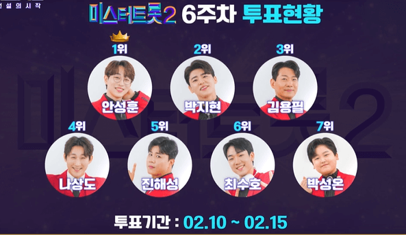 미스터트롯2 6주차투표현황입니다. 투표기간은 2.10~2.15일까지 입니다.