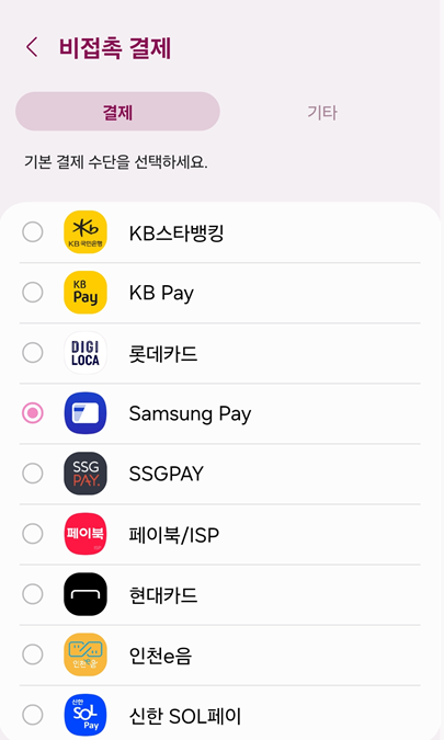 - Samsung Pay 앱 설정: 비접촉 결제 버튼을 선택한 다음 Samsung Pay 앱이 제대로 선택되어 있는지 확인합니다.