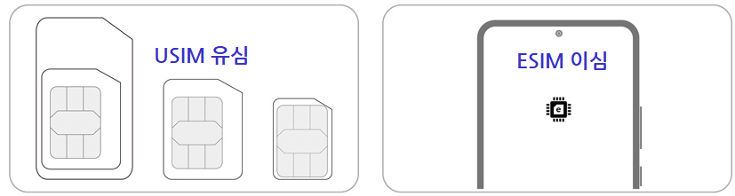 서론이 길어졌습니다. 일단 유심과 이심이 뭔지 보시면 아래처럼 기계가 바뀌어도 하나의 유심이 있으면 제가 유심만 빼서 넣을 수 있는 것이고 이심은 기계 자체에 있는 것이라고 하네요. 아직 이심은 교통카드기능도 되지 않는다고 하고 검색해보면 일본이나 베트남 여행등 해외여행시 많이 쓰이더라고요.