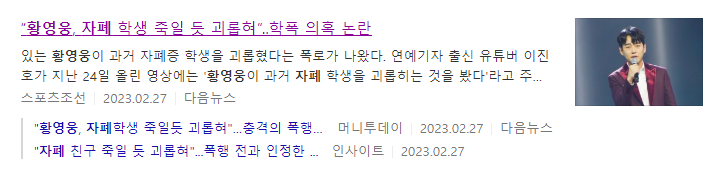황영웅은 고등학교에 진학해서도 끔찍한 학교 폭력을 저질렀다고 합니다. 이진호는 "일부 후배들은 목 졸림을 당하고 복부를 때리고 벽에 밀치는 등 폭행 피해를 당했다. 술을 마신 뒤에는 정도가 심해졌다는 증언이 이어졌다"고 설명했고요.